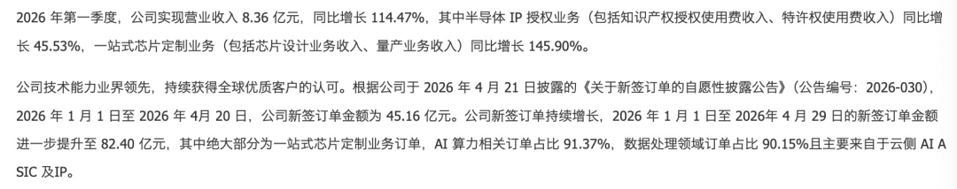 根据披露,2026年1月1日至4月29日,公司新签订单金额为82.40亿元,其中绝大部分为一站式芯片定制业务订单,AI算力相关订单占比91.37%,数据处理领域订单占比90.15%且主要来自云侧AI ASIC及IP。